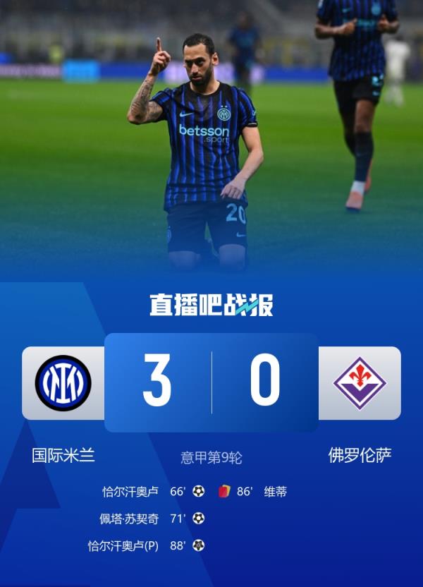 意甲-国米3-0佛罗伦萨 恰尔汗奥卢点射+双响苏契奇个人秀建功