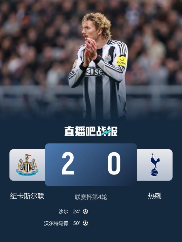 联赛杯第四轮,纽卡2-0完胜热刺晋级,沙尔破门,沃尔特马德建功。